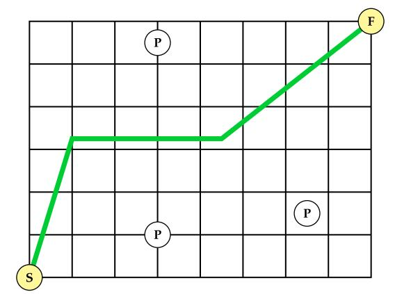 并查集题目,将左和上面的两条边看作起点,将右和下面的两条边看作终点,如果起点和终点相互连通,则S和F点将无法连通。